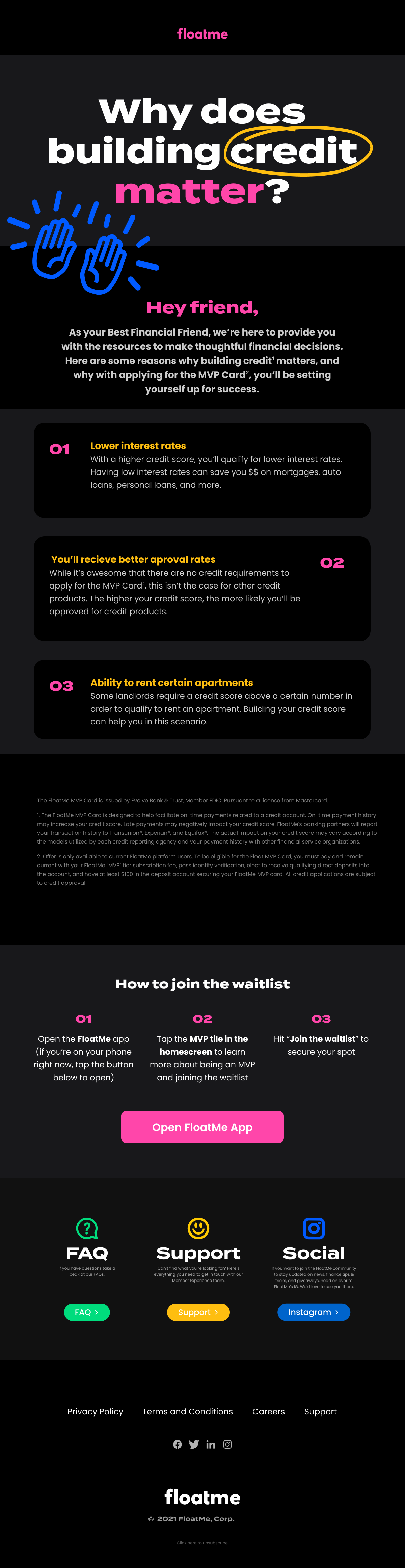 The FloatMe Financial Copy and Brand Strategy Project is focused on refining and elevating the brand voice of FloatMe, a financial technology company dedicated to helping users manage their cash flow and avoid overdraft fees. This project aims to develop clear, engaging, and conversion-driven copy that aligns with FloatMe’s mission of financial empowerment while ensuring brand consistency across all digital touchpoints.